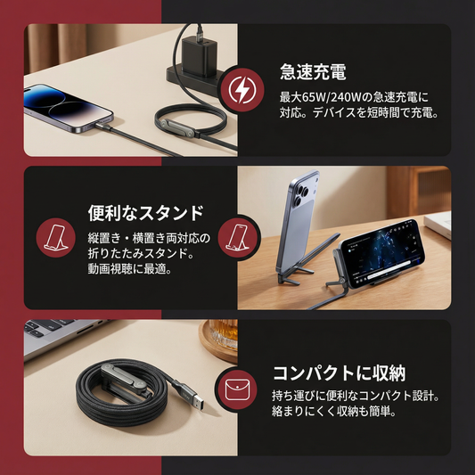 2in1 折りたたみ式 急速充電ケーブル&スマートフォンスタンド