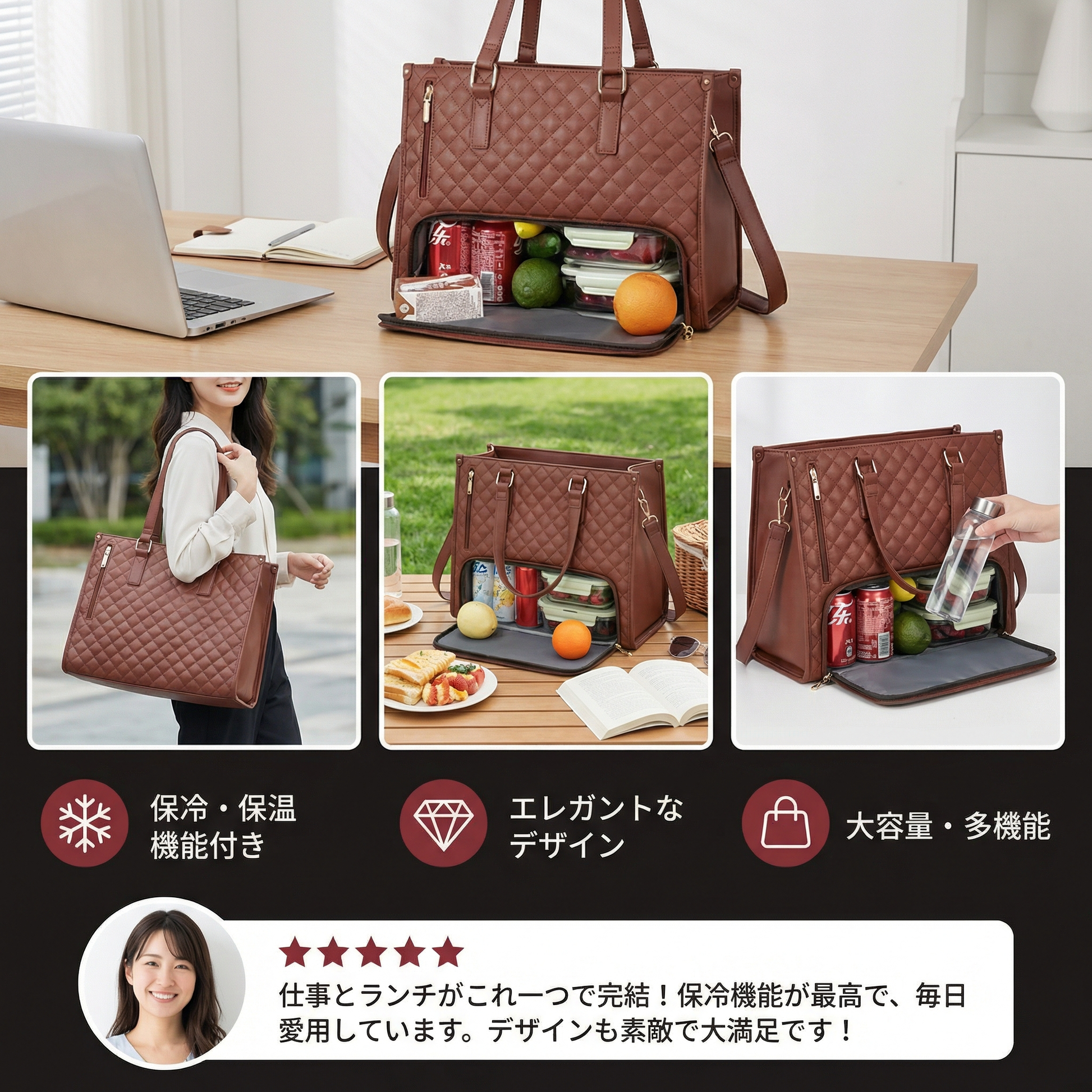 “保冷ポケット内蔵のオールインワン女性用ハンドバッグにとても満足しています。見た目がおしゃれなだけでなく、使い勝手も抜群です。スナックや飲み物をいつでも新鮮に保ちながら、他の必需品もすべて一緒に収納できる点が特に気に入っています。”