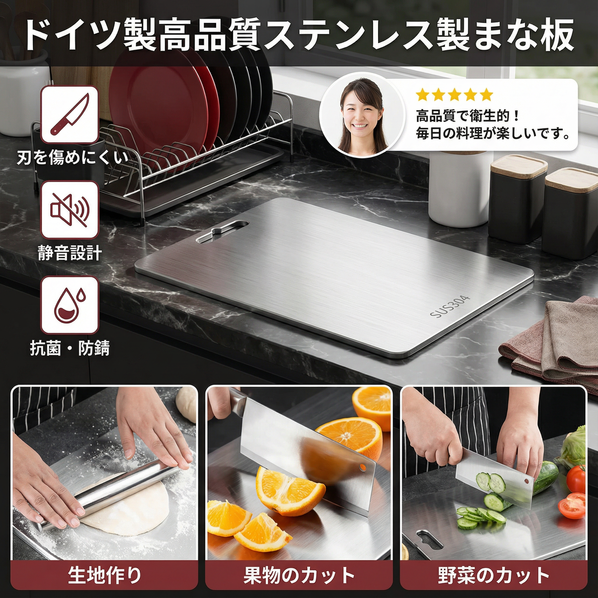 “のまな板は非常に丈夫で、鋭い包丁を使っても傷がつきません。特に衛生的で洗いやすい点がとても実用的で、毎日のキッチン作業に最適だと感じています。”