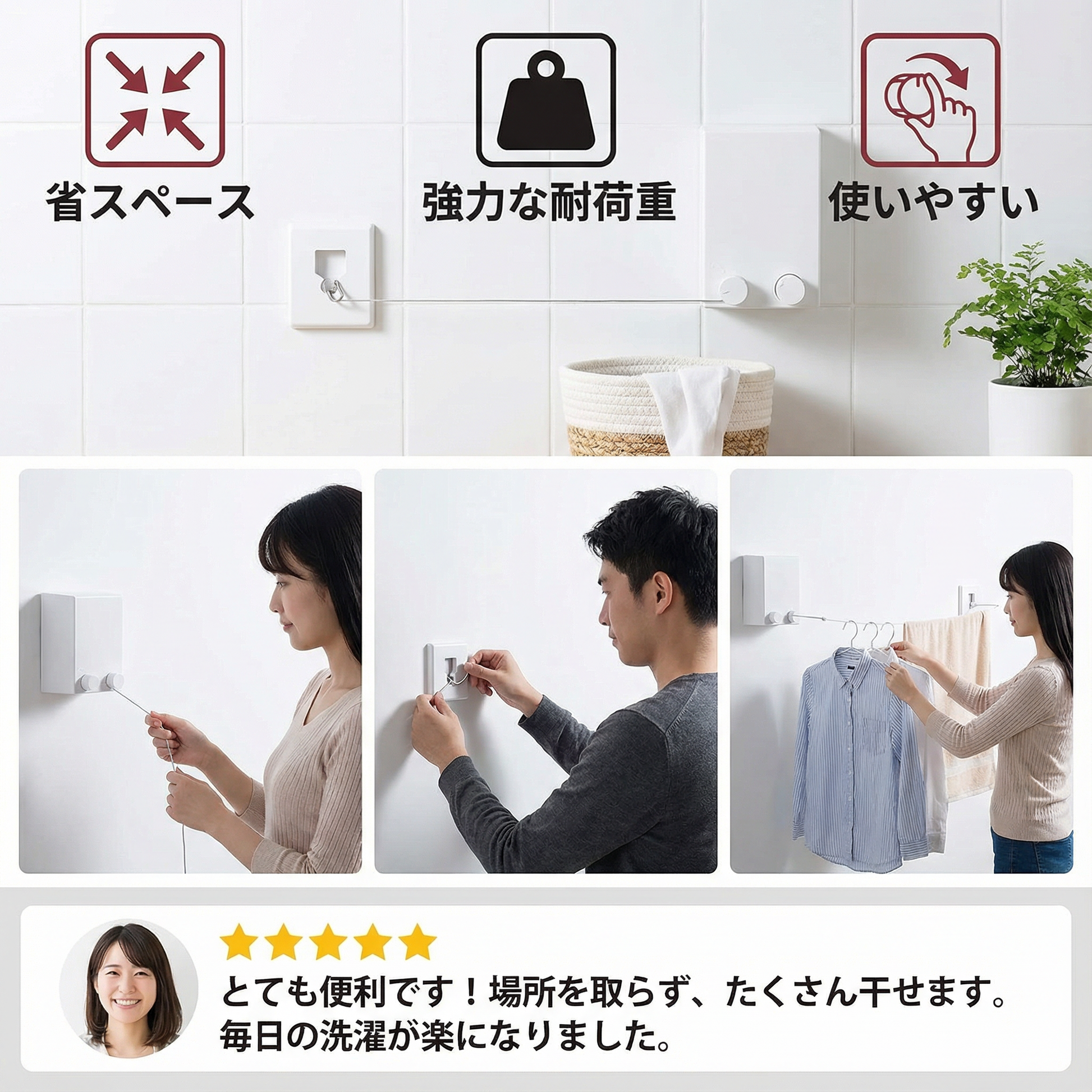 “伸縮式洗濯ロープは、小さなアパートに本当に素晴らしい解決策です。簡単に取り付けができ、必要な時に素早く引き出せるので、乾燥スペースを確保しながら、スペースを節約することができます。”