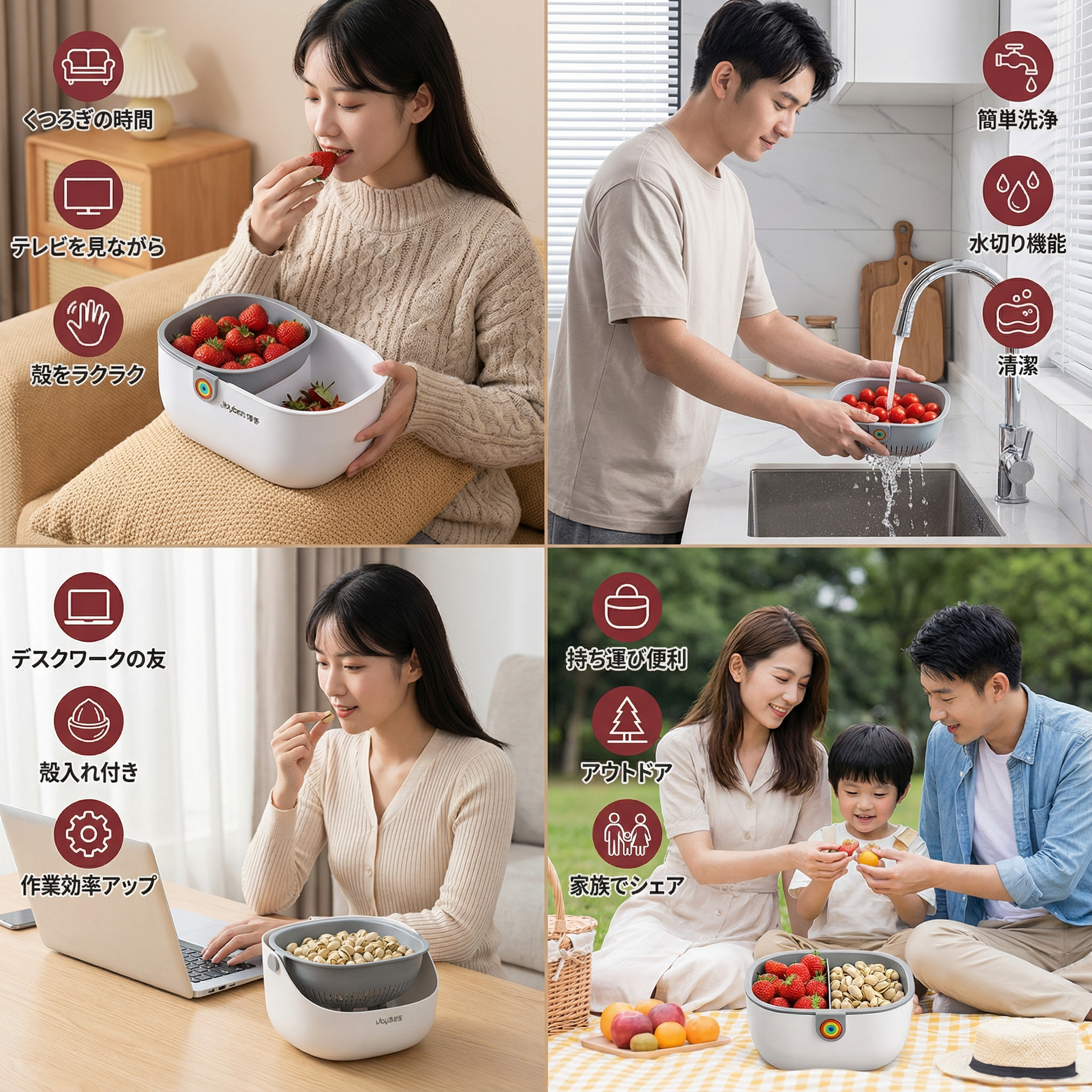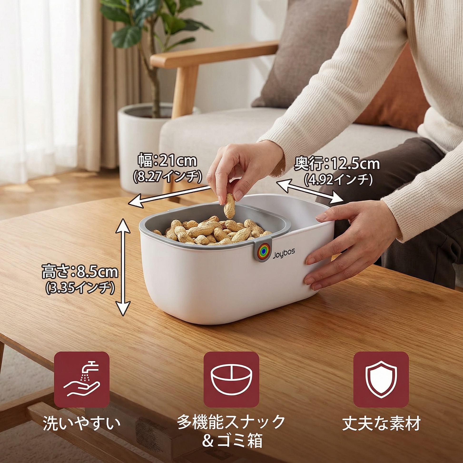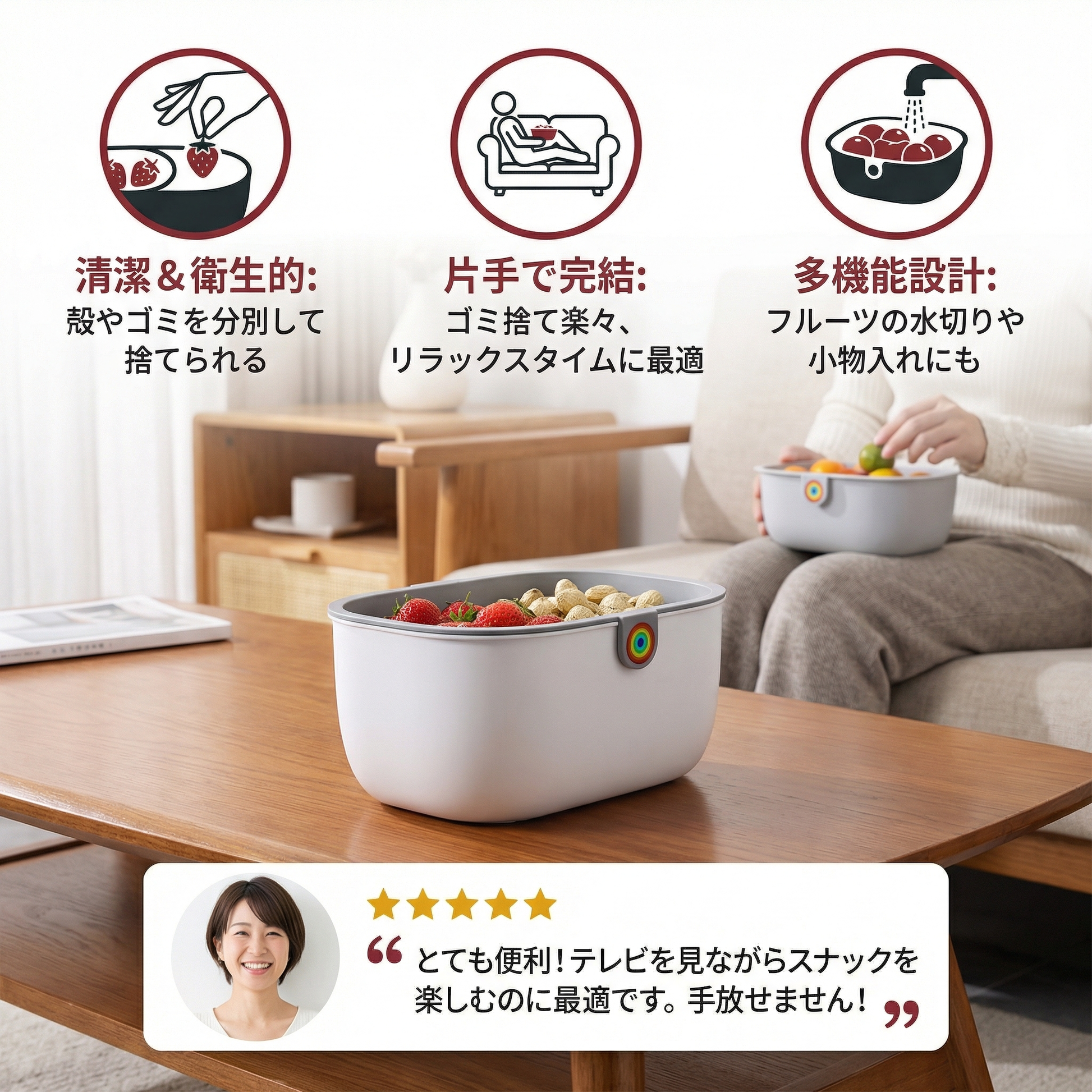 “実用的な2段スナックボウルは、テーブルを散らかさずに殻やゴミを直接集めるのに最適です。特に便利なのは、スナックを食べるときにソファでより快適に使えるように設計されており、さらに簡単に掃除できる点です!”