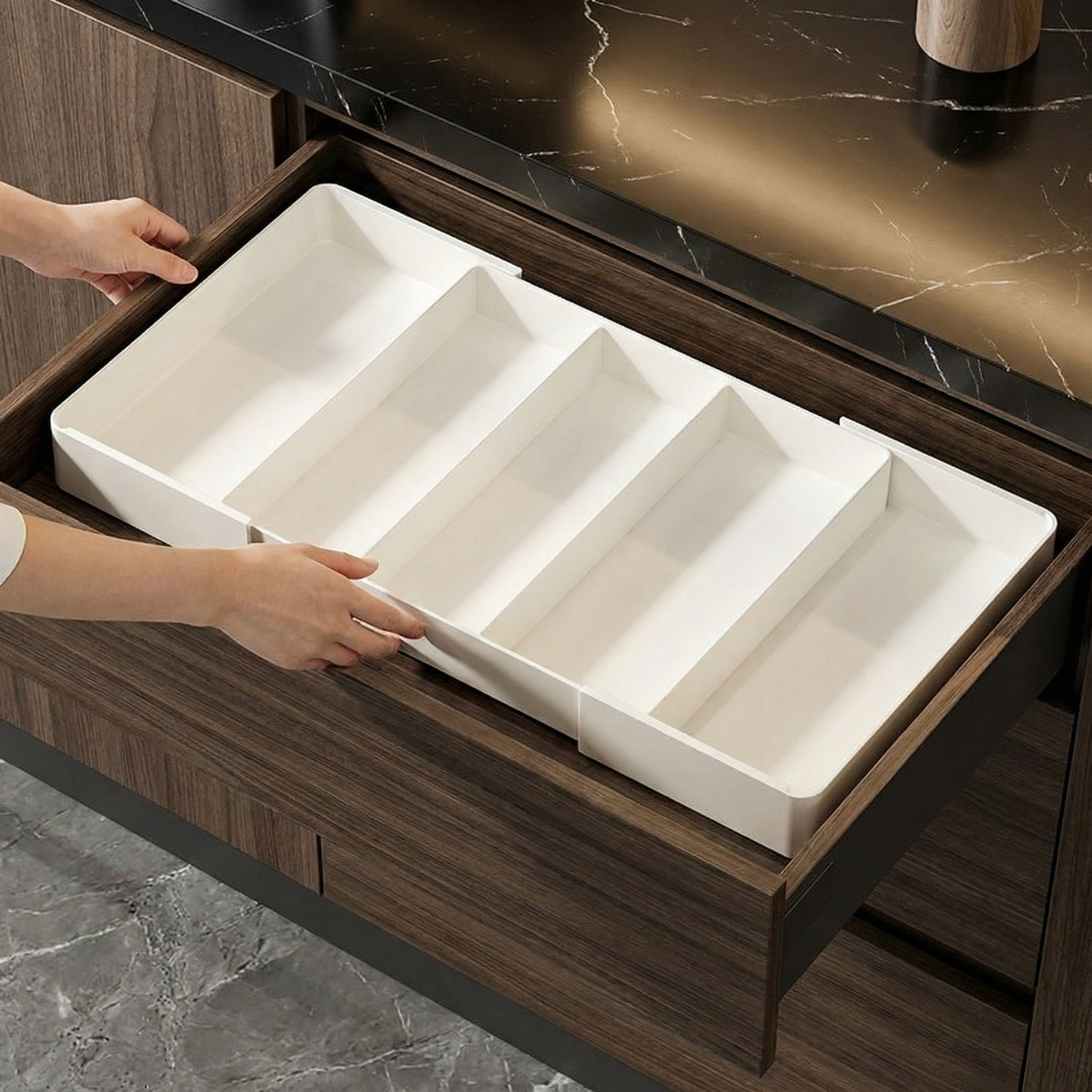 モダンなデザインは実用的なだけでなく、見た目も魅力的。どんなキッチンインテリアにも自然に溶け込み、引き出しの中に美しい秩序をもたらします。