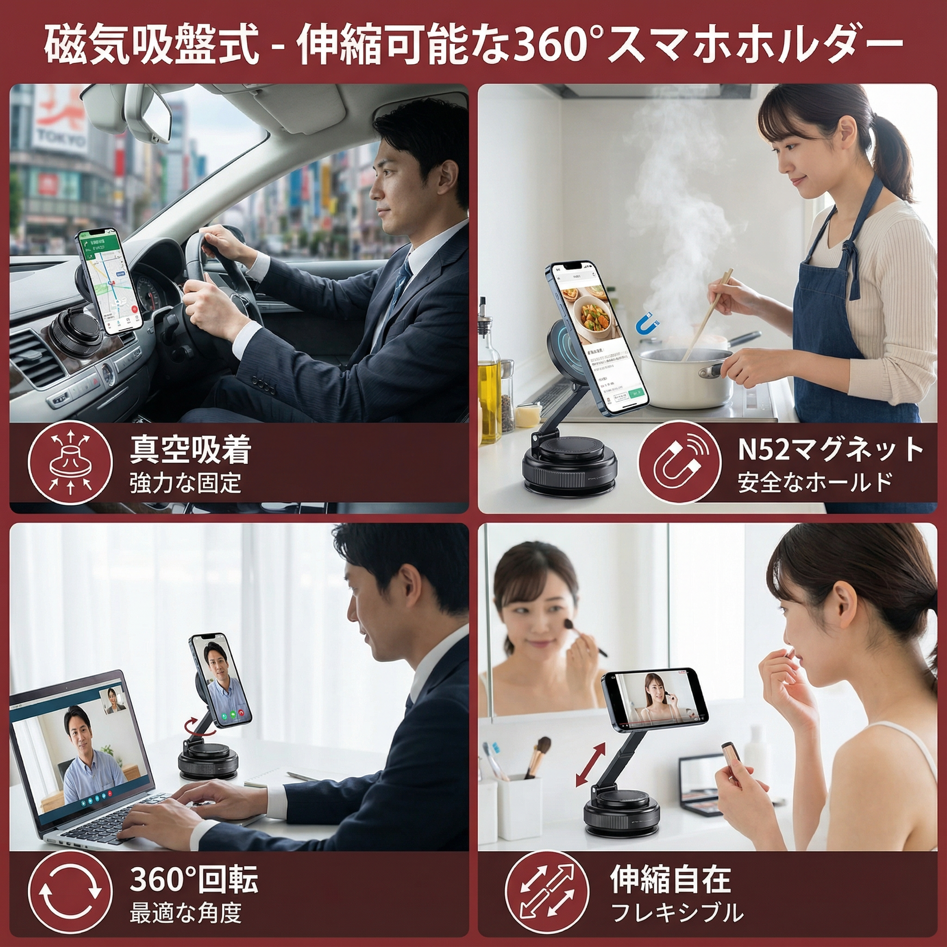 “磁気吸盤式の伸縮360°スマホホルダーは本当に便利なガジェットです。自宅でも車内でもスマホをしっかり固定でき、360°回転機能により完璧な角度で画面を見ることができます。”