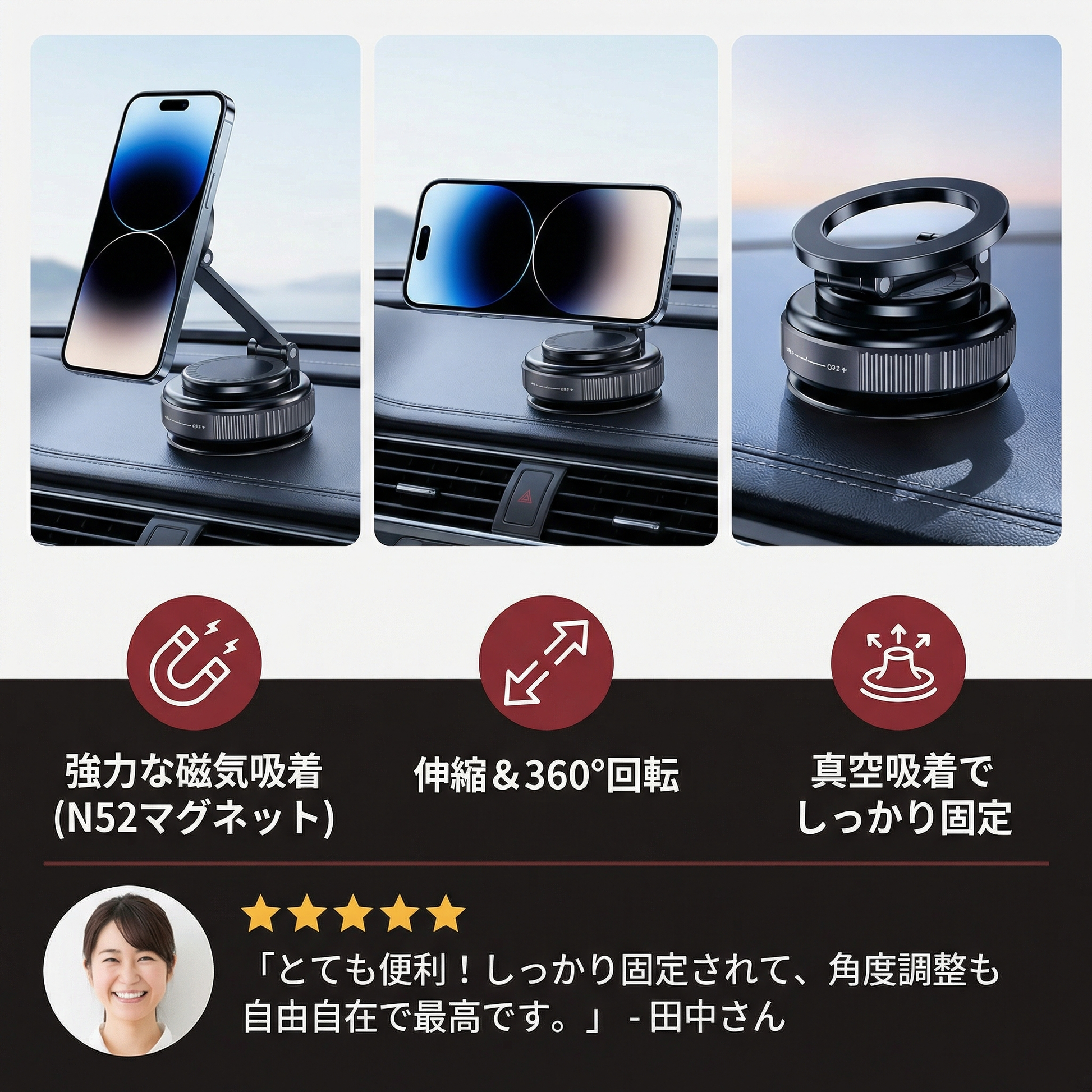 - 🚗 真空吸着式で安定した固定: 平らな面ならどこでも強力に吸着、車内や自宅でも安心です。