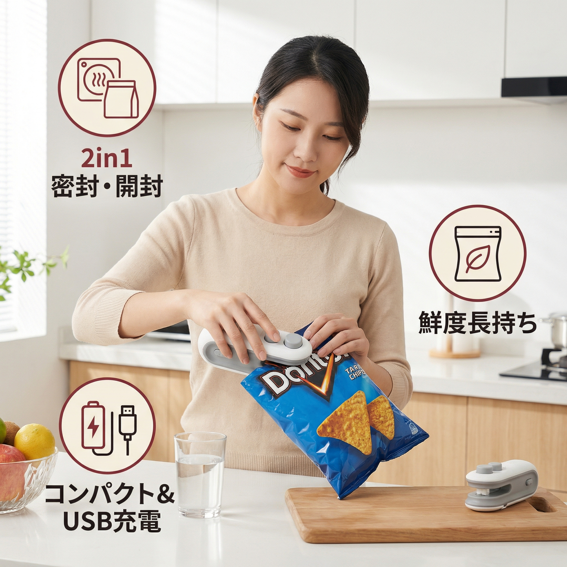 チップスの袋を開けて、次の日にはしんなりしていることに気づいた瞬間を知っていますか?この便利な2-in-1ミニシーリングデバイスで、その悩みは過去のものになります。このデバイスは、パッケージを数秒で密封し、食品を長期間新鮮でパリッとした状態に保ちます。うまく機能しないゴムバンドやクリップを使う手間はもうありません。簡単な動きで強力な密封を作ることができます。
